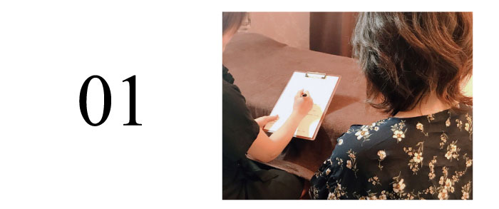 ご来店後、問診票をご記入いただきます。 問診票をもとにカウンセリングを行います。 その後、施術についての説明をいたします。 この時にわからないことや不安なことなど少しでもあれば遠慮なく聞いて下さい。