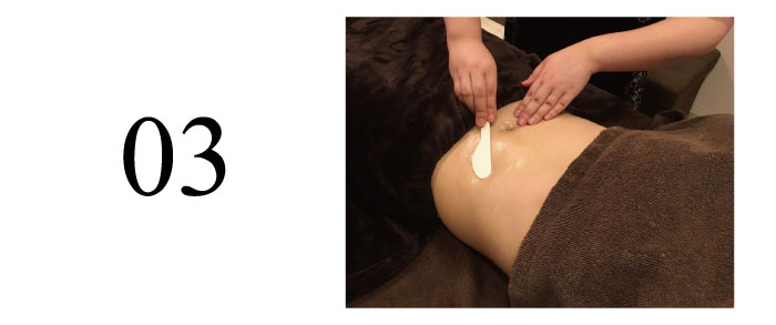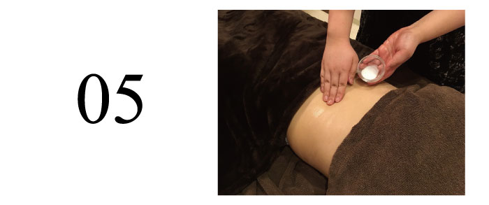 ふきとり後、施術部位に専用オイルを塗り広げます。
