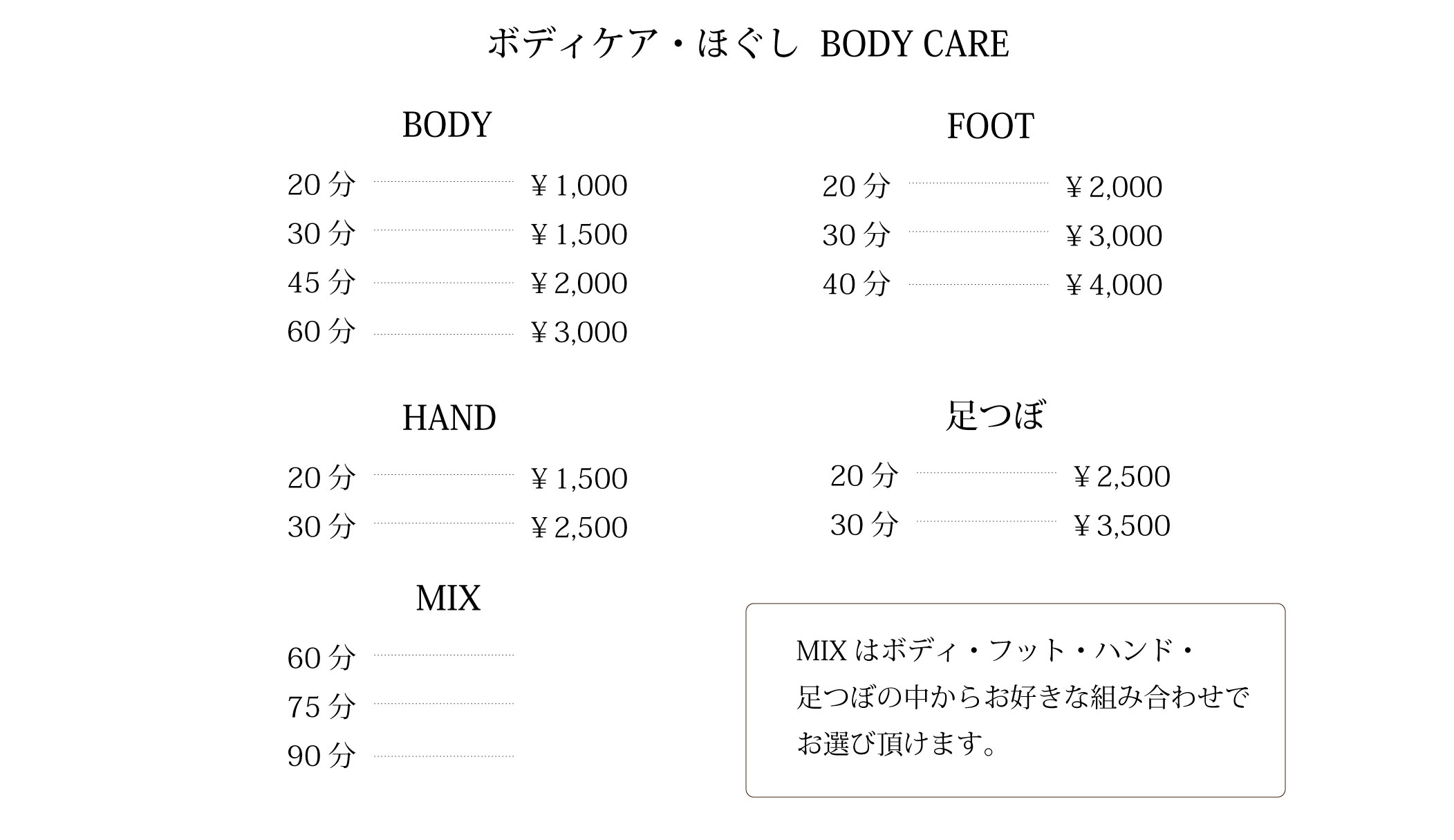 当店のリラクゼーションマッサージはもみほぐしから本格的な上海式エステまで美容と健康に意識した施術を行っております。 ほぐしによって筋膜リリースで筋肉と骨の癒着をはがします。上海式エステは、小顔効果や二の腕・ウエストのシェイプアップなど本場のエステです。
